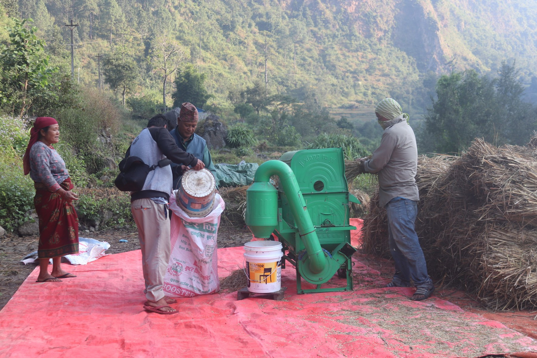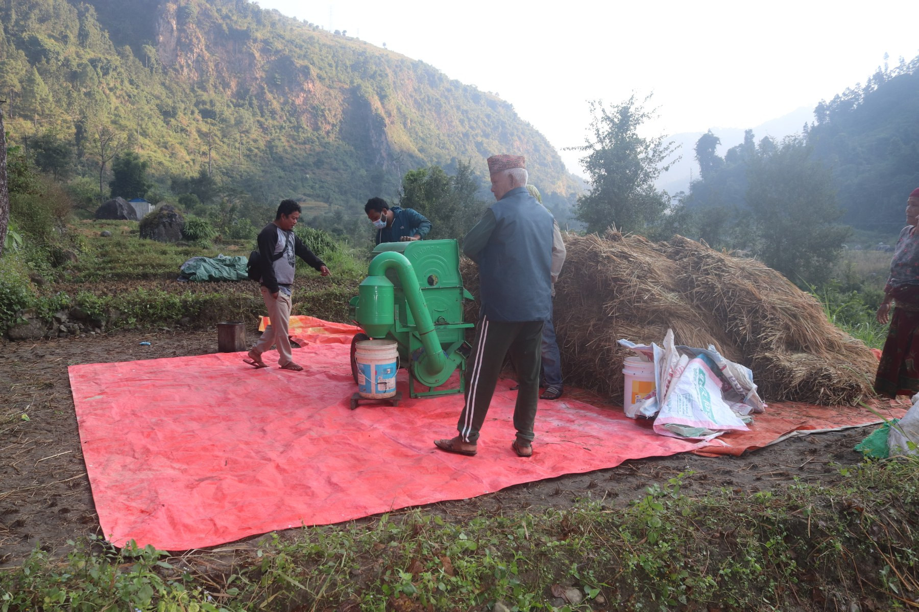 मकावापुरको भिमफेदी गाउँपालिका वडा नं.–४ स्थित चिउरीबगैंचामा बुधवार बिहान थ्रेसर मेसिनबाट धान झार्ने काम गर्दै स्थानीय किसानहरु । यो मेसिन आए सँगै किसानहरुलाई धान झार्न सजिलो हुनुका साथै धान झार्न आउने खेताला र समयको बचत हुने गरेको पाईएको छ । यो मेसिन आएदेखि चिउरीबगैंचा क्षेत्रका स्थानीय किसनाहरुलाई धान झार्न हुने झन्झट हटेकोछ । उक्त धानबाट करिब ठूलो बोराको ३० बोरा चामल निस्कने स्थानीय किसानहरुले बताउनुभएको छ ।